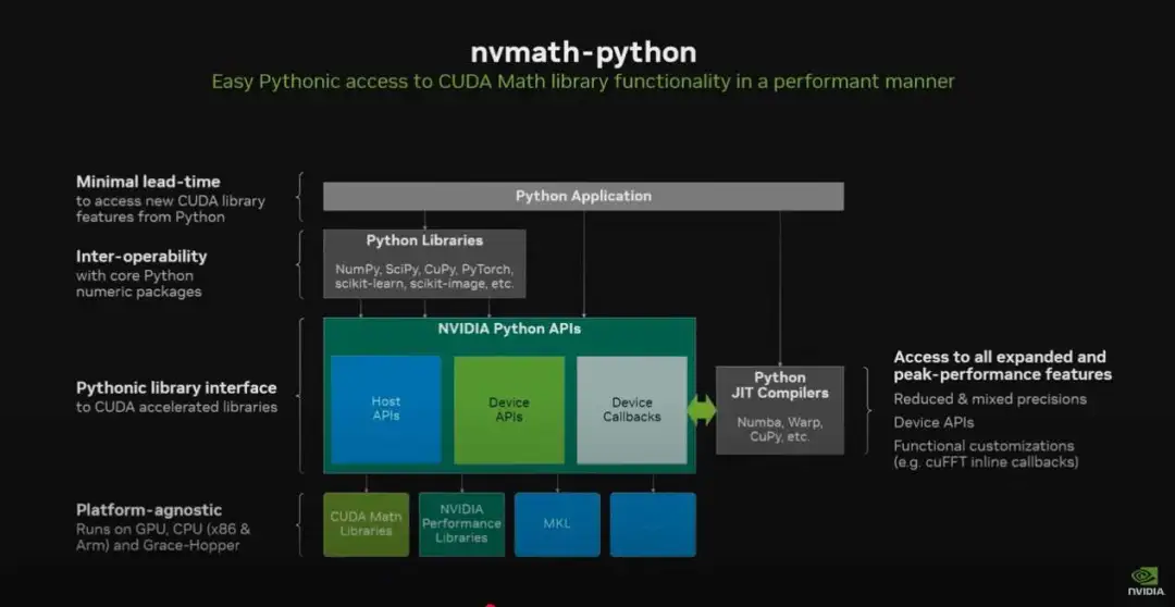 英伟达还开发了一套名为 NVMath Python 的库,其具备用于主机端和设备端库调用的统一接口。Jones 指出,这种将库调用加以融合的设计带来了巨大的性能提升。