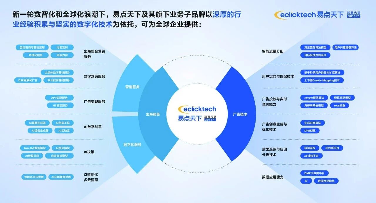 作为全球领先的企业国际化智能营销服务集团,易点天下以深厚的行业经验积累与坚实的数字化技术为依托,围绕“营销服务+数字化服务”两大模块,不断将广告营销技术与AI能力深度融合,持续拓展出海服务边界,构筑行业高价值竞争壁垒。