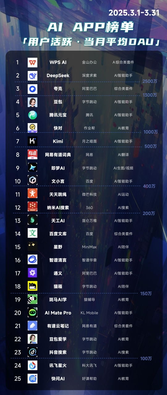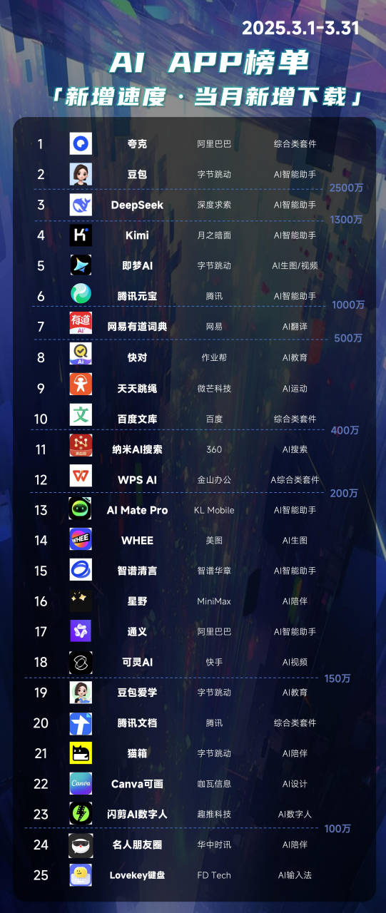 除AI智能助手和AI教育共同领跑外,AI笔记、AI记账、AI输入法、AI趣味性创作等创新性场景开始崭露头角。2025年3月,AI APP产品总新增下载超过1.6亿,平均每天有约2亿人在使用AI APP,共6款产品当月新增下载超千万,6款产品的平均DAU超过千万。