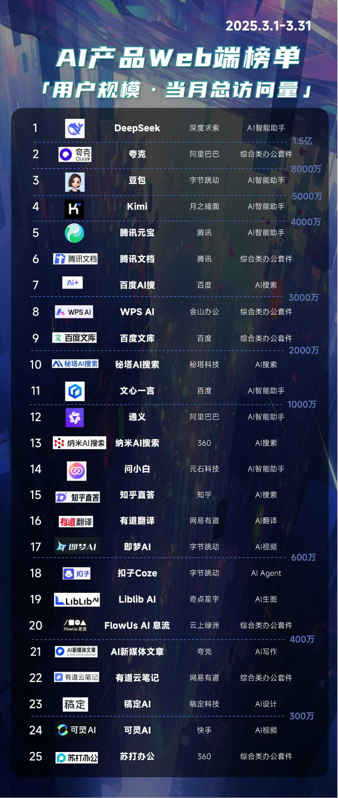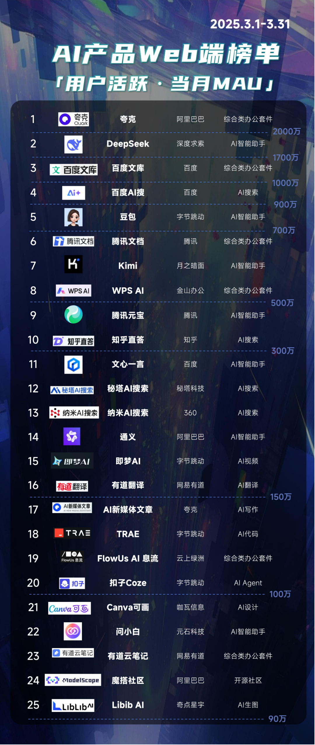 在Web端,头部产品主要由互联网大厂掌控,业务矩阵联通和一站式AI工作流特色明显。2025年3月,Web端AI产品访问总量超过6亿,总月活超过1.2亿,共11款产品总访问量超过千万,20款产品MAU超过百万。