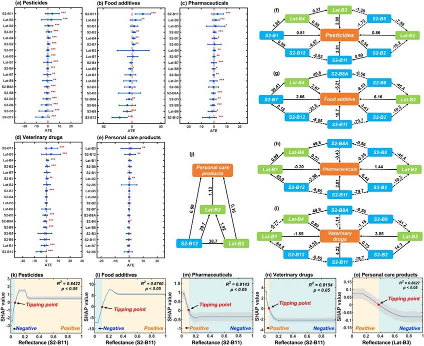进一步运用可解释机器学习方法(因果推断与SHAP)分析18个卫星遥感波段对ECs非靶向预测的具体贡献。结果表明,短波红外(SWIR)波段,尤其是S2-B11,在农药、药品、兽药和食品添加剂等EC类别的预测中具有显著增强作用。S2-B11具备良好的穿透雾霾和云层能力,同时对DOM和EC中芳香结构具有较强响应,适合水体成分探测。而S2-B12则普遍表现为负向影响,推测原因包括其信噪比低、穿透能力差、对水体成分反映不明显及其与S2-B11之间存在多重共线性。相较之下,蓝带(Lat-B2)与绿带(Lat-B3)也表现出较强的正向作用,有助于检测悬浮颗粒与富含疏水结构的DOM/EC吸附分布。此外,SHAP分析揭示,不同波段反射率对EC预测效果存在类别差异:反射率增强有利于农药和食品添加剂的检测,而对药品、兽药和个人护理产品预测精度构成干扰。其机制可能与不同EC分子中极性/非极性官能团比例有关——极性官能团(如羧基、羟基等)易吸收SWIR波段光,反射率低且易受噪声影响;非极性基团则倾向反射,提升模型信噪比与判别能力。上述分析明确了波段选择对EC预测的关键性,为未来遥感光谱变量的筛选与建模提供了理论依据。