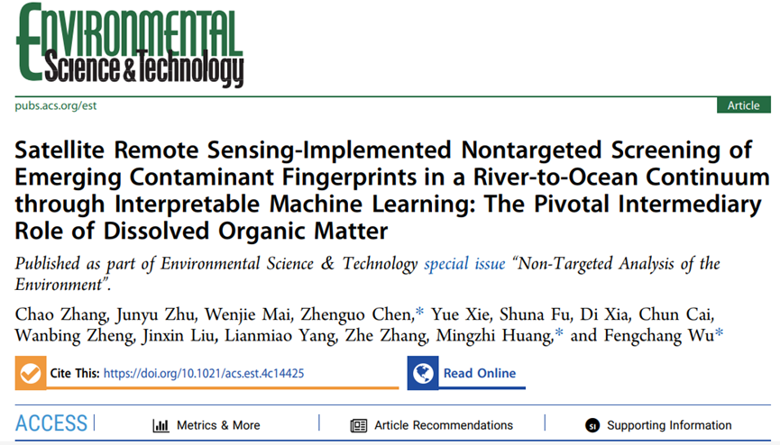 近日,中国环境科学研究院吴丰昌院士与华南师范大学黄明智团队合作,在环境科学领域期刊Environmental Science & Technology杂志上发表了一篇题为“卫星遥感通过(可解释)机器学习对河流到海洋连续体中新污染物指纹的非靶向筛查:溶解有机物的关键中介作用”的研究论文。该研究将多光谱遥感技术与机器学习模型结合,利用卫星遥感数据以溶解有机物DOM作为中介变量,构建了河流到海洋连续体中新污染物非靶向筛查的预测模型,并通过可解释机器学习SHAP与双重因果推断模型探究了卫星遥感波段对新污染物非靶向预测的具体贡献。