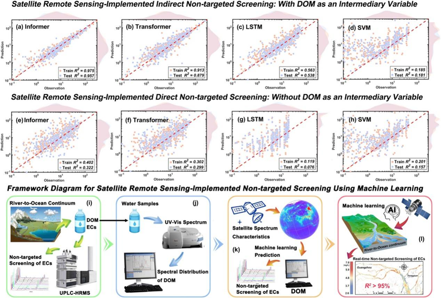 本研究提出通过引入DOM作为中介变量,弥合卫星遥感光谱与水体中ECs丰度之间的预测差距,从而提升ECs非靶向筛查的精度。由于ECs在天然水体中的浓度极低(ng/L级),直接利用卫星影像进行预测存在显著难度。相比之下,DOM在河流至海洋的连续体中广泛分布,且其光谱特征中包含部分ECs的光学指纹信息。基于此,研究采用Landsat-8与Sentinel-2卫星影像,结合实测DOM光谱及UPLC-HRMS的非靶向筛查数据,构建了以DOM为桥梁的机器学习预测框架。采用3种机器学习方法(SVM、XGBoost、GPR)与5种深度学习算法(Informer、TCN、Transformer、CNN、LSTM)进行比较,结果显示以DOM为中介变量的预测模型显著优于直接预测模型,其中Informer算法表现最佳,R²值达到0.957。与不使用DOM相比,深度学习预测精度提升2.59至7.08倍,机器学习方法提升1.15至5.71倍。该方法有效整合遥感数据、DOM信息与化学丰度特征,为实现高效、低成本的新污染物监测提供了新思路,并展示了DOM在污染物遥感预测中不可忽视的关键作用。