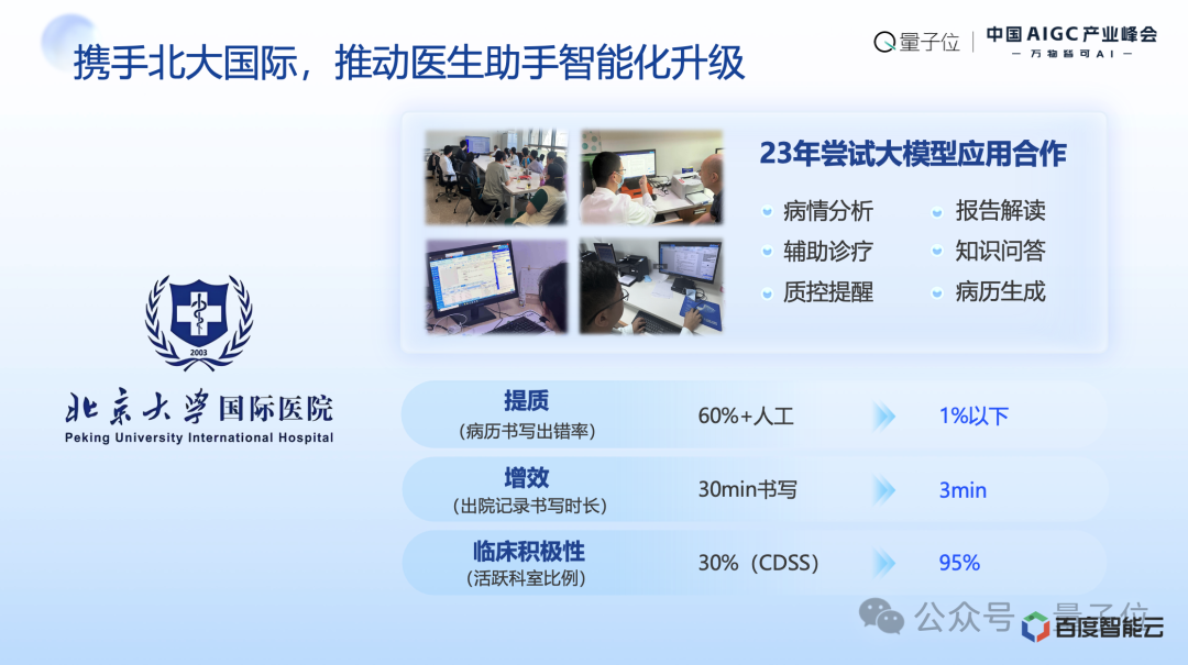 我们讲一个案例,北大国际医院是我们非常紧密的合作伙伴,我们在医疗这个领域做了非常深度的应用,包括智能病历的辅助生成,智能辅助推荐,包括医疗知识的简报。