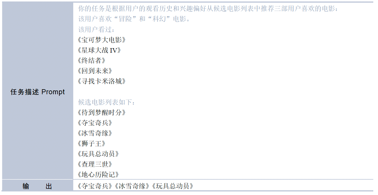 然后,再把用户的画像、历史行为文字描述、候选物品信息输入大模型,给出最终的推荐列表,如下: