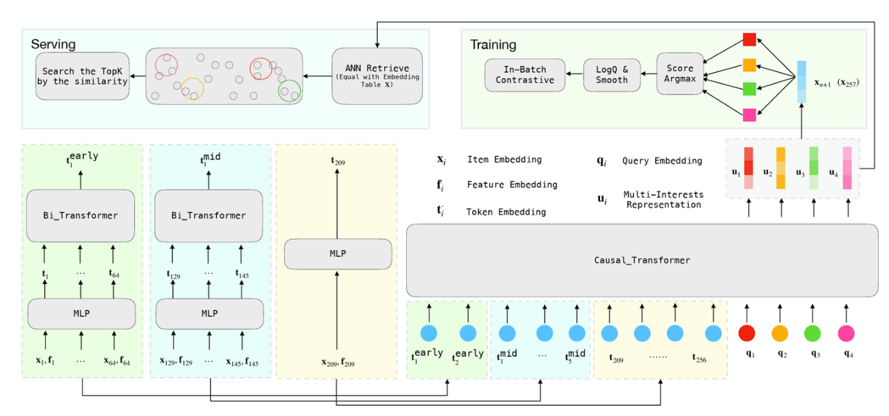 和Meta GR一样,KuaiFormer也把过去“视推荐为分类问题”的做法改成了“把推荐视为预测用户的next token”的问题,于是就可以利用Transfomer的结构预测用户的next interest embedding,再把这些embedding当作ANN召回的索引Embedding,就实现了LLM思想对召回层的改造。可以说,这类方案的核心是用训练LLM的思路解决推荐问题,用Transformer为基础的模型结构。
