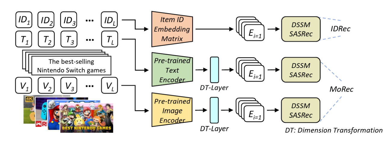 本质上,多模态大模型这里被当做了一个功能强大的encoder,过去我们想构造一个多模态推荐系统,还需要为相应的模态分别构建encoder,现在一个预训练的多模态大模型,或者是成熟大模型公司的api就解决所有问题。具体的方案有很多,比如下图的MoRec使用Switch游戏的介绍图片和介绍文字构建多模态特征,进行游戏推荐。