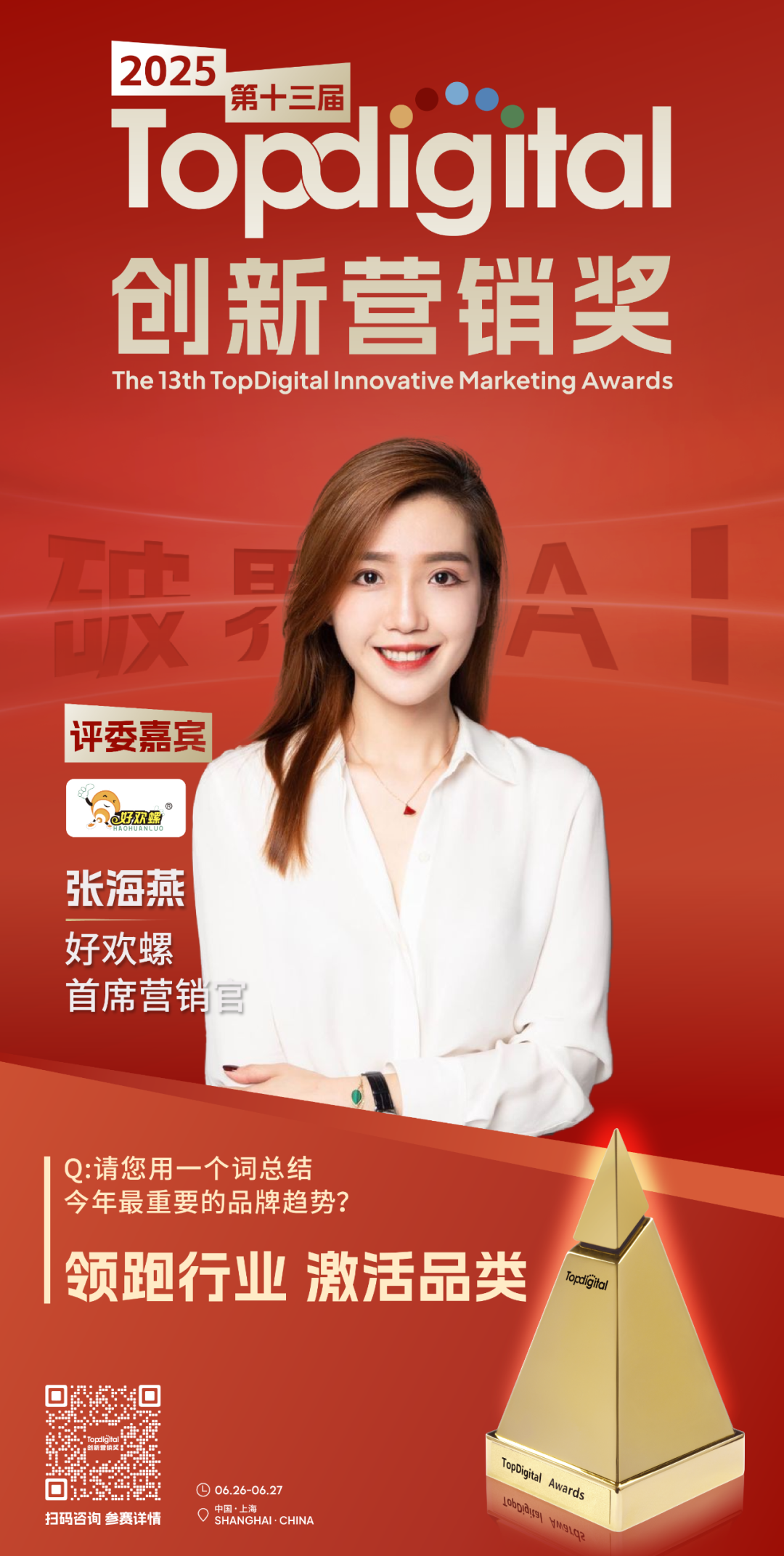 当生成式AI在1秒内完成人类72小时的创意产出,当智能算法精准预判用户下一秒的消费冲动,我们正站在营销革命的临界点。全球数字营销市场以23.6%的年复合增长率狂奔,AI技术的渗透率却在短短18个月内从实验性应用跃升为行业基建——这不是技术迭代,而是认知维度的颠覆性跃迁。2025年将成为AI发展的关键之年,在此背景下,2025第十三届TopDigital创新营销盛典以“破界· AI”为年度主题应势而生,一场解构商业本质的双向革命开启了!此次TopDigital非常荣幸邀请到好欢螺首席营销官张海燕加入专家评审团,与我们共同见证品牌典范、杰出产品、精彩案例以及优秀服务机构的诞生。