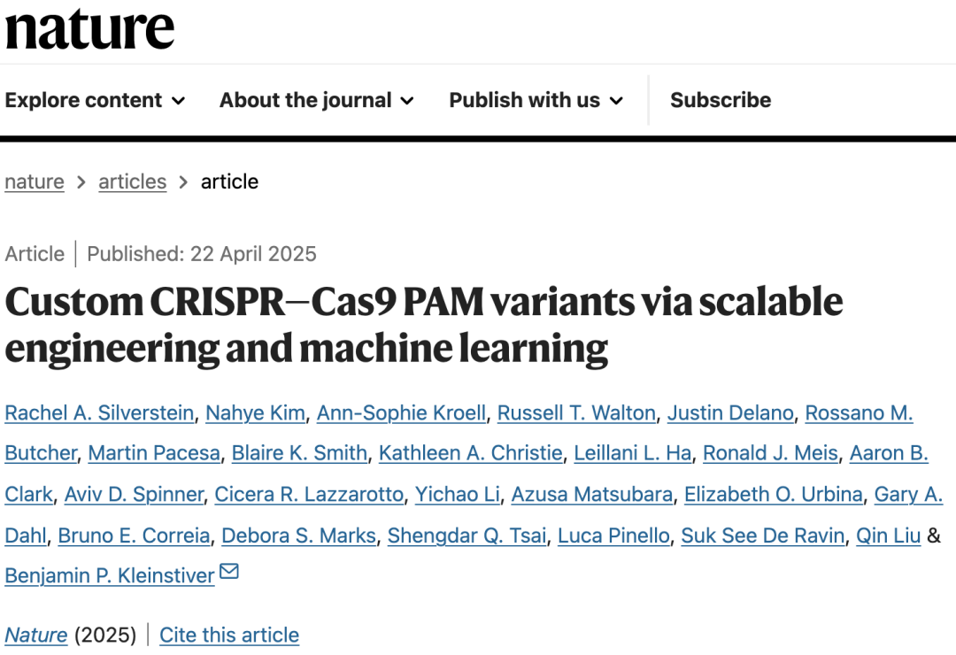 2025年4月22日,Benjamin P. Kleinstiver团队在Nature发表论文:Custom CRISPR—Cas9 PAM variants via scalable engineering and machine learning。他们开发出一套集饱和突变、机器学习与进化模拟于一体的系统性平台,成功构建出一个“PAM定制”的Cas9酶库,为精准基因编辑开辟全新路径。