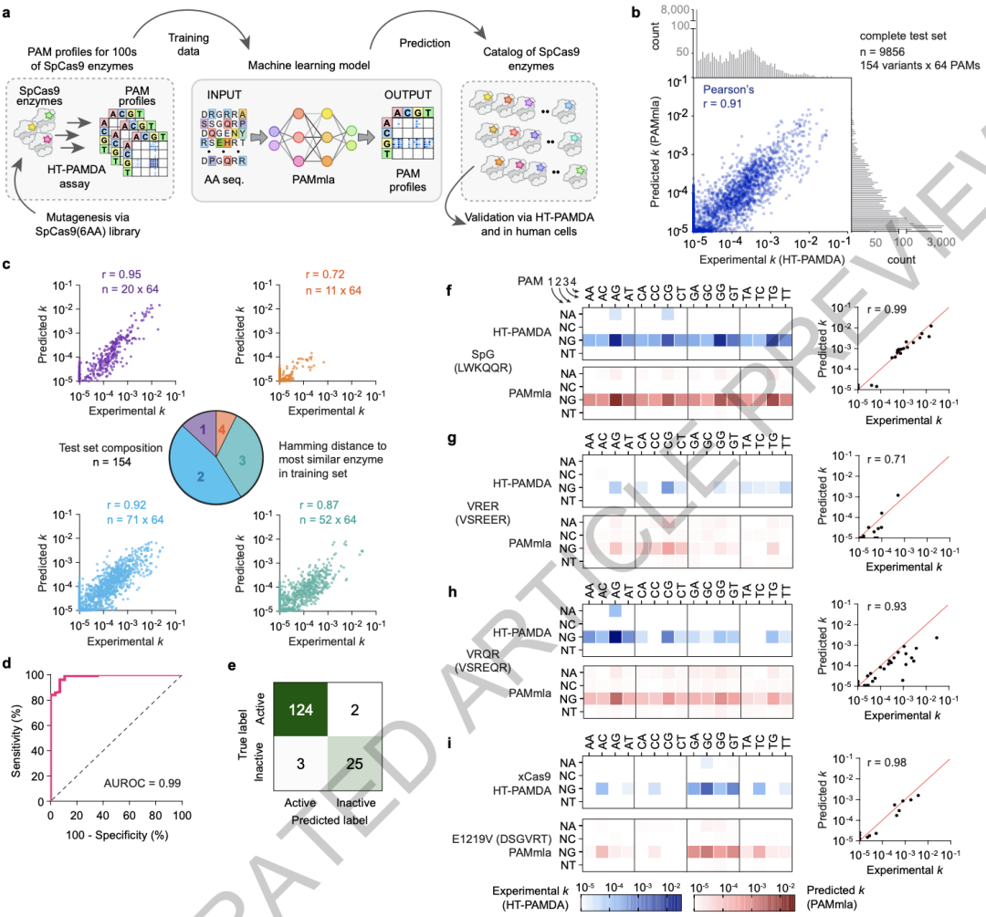 研究者将实验数据训练进神经网络模型PAMmla,成功实现了从氨基酸序列预测PAM识别谱的能力,预测准确度达到Pearson’s r=0.91。同时,PAMmla还能区分活性与非活性酶(AUROC=0.99),并对未见过的酶具备良好的泛化能力。