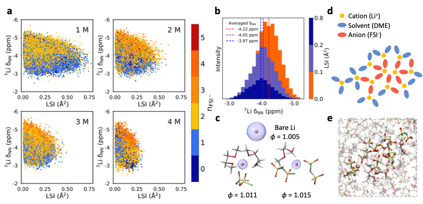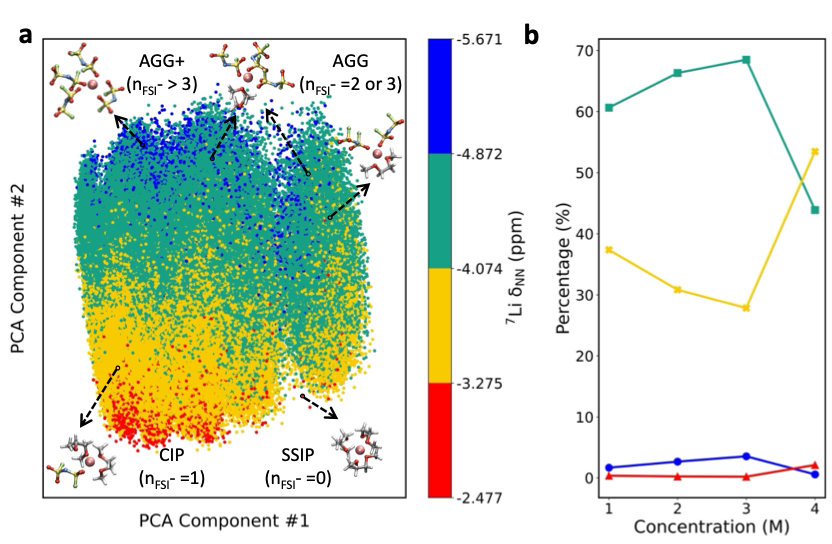 全文速览近日,厦门大学与嘉庚创新实验室利用机器学习联用方法,在计算电解液动态核磁共振(NMR)谱解析领域取得重要突破,实现了对双氟磺酰亚胺锂(LiFSI)/二甲醚(DME)电解液中动态的⁷Li核磁共振化学位移的预测。预测结果精准揭示了⁷Li核磁共振化学位移的反转现象,与实验观测结果吻合。该成果是团队继电池正极材料动态核磁谱研究和NMRNet深度学习框架之后,在相关领域的又一次方法迭代与体系应用拓展,相关研究成果已发表于顶级化学期刊《Journal of the American Chemical Society》。 该项研究成果的通讯作者为厦门大学程俊教授和汤富杰副教授,厦门大学化学化工学院2023