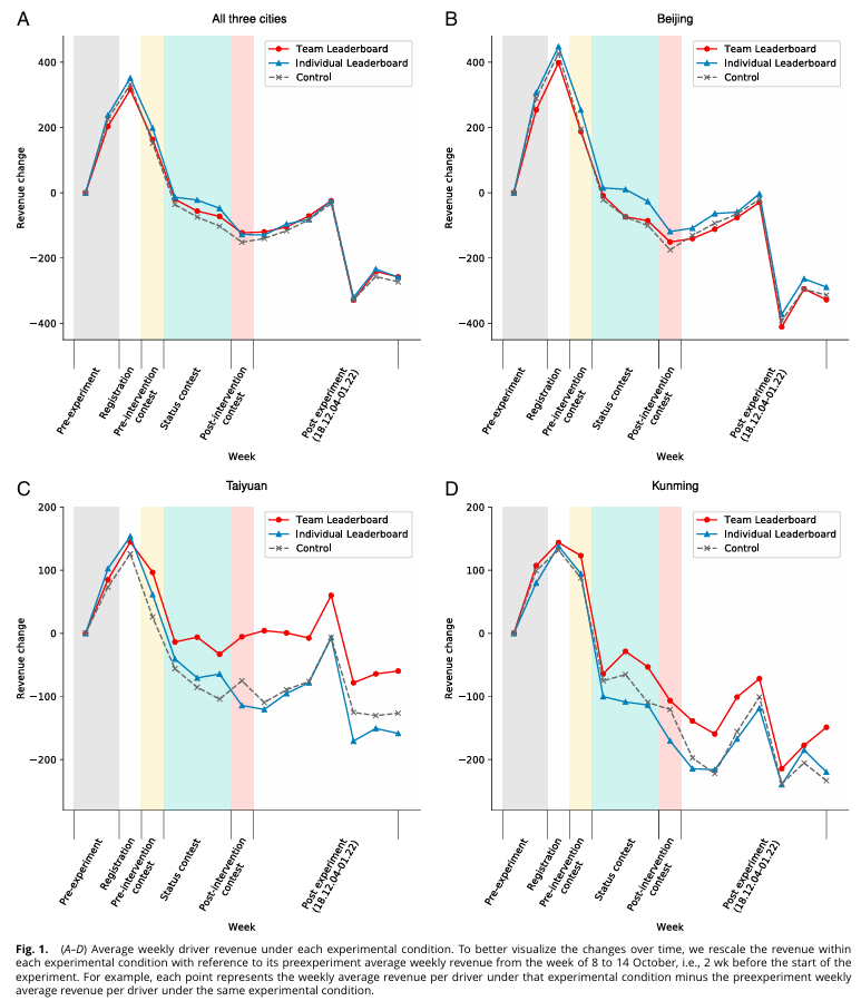 留存率提高:实验结束 3 个月后,团队排名组司机平均每周比对照组多工作 1 小时(3.16%)。在城市层面,太原团队排名组司机每周多工作 3 小时(11.83%),北京和昆明的处理组与对照组司机工作时长无显著差异。