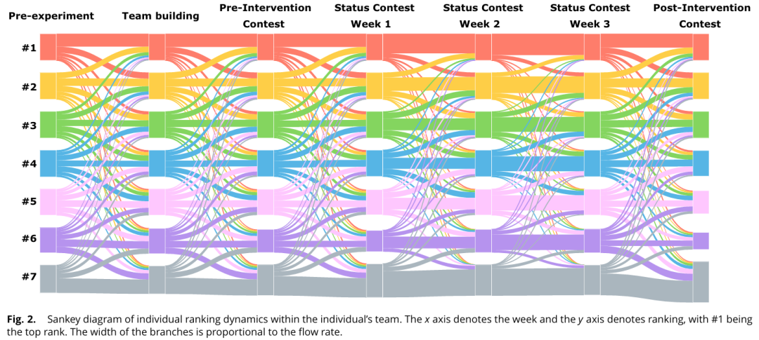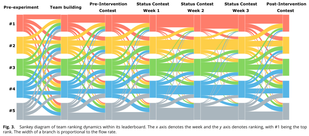 个人团队中个人排名动态的桑基图。x 轴表示周,y 轴表示排名,其中 #1 是最高排名。树枝的宽度与流速成正比。