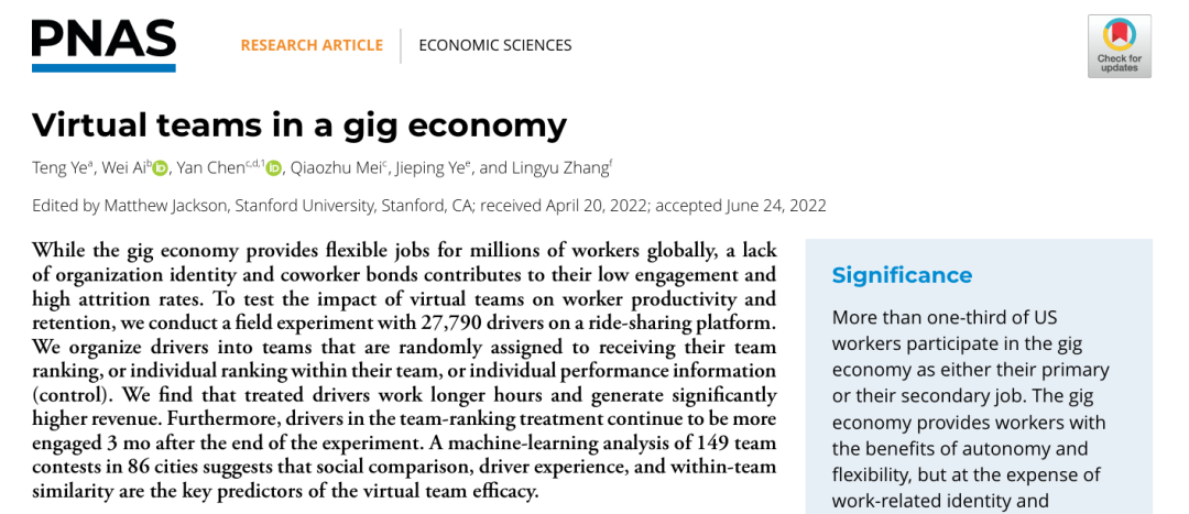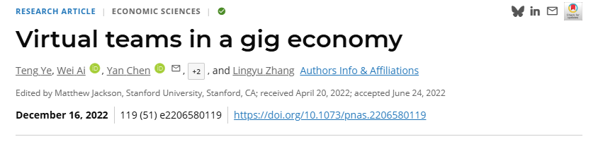 Ye T, Ai W, Chen Y, et al. Virtual teams in a gig economy[J]. Proceedings of the National Academy of Sciences, 2022, 119(51): e2206580119.