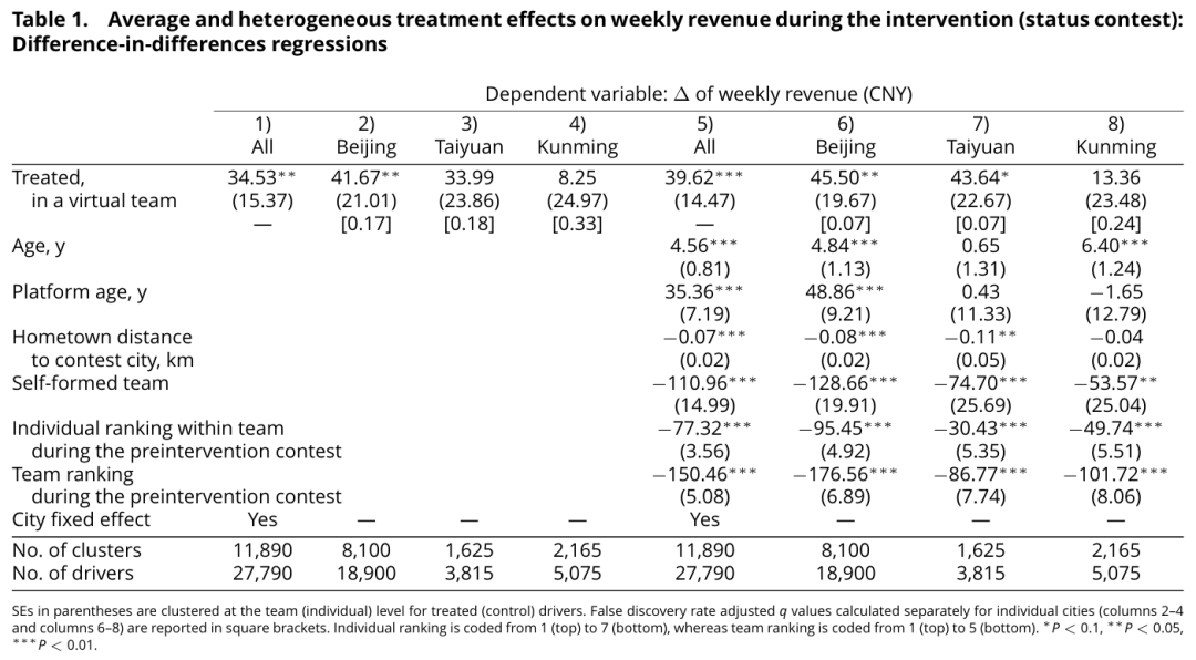 导读:在零工经济中,灵活工作模式虽有优势,但导致从业者缺乏组织认同感和同事联系,出现参与度低、流失率高的问题。研究团队通过对某出行平台27,790 名司机开展实地实验,组建虚拟团队并设置不同排名信息查看条件,发现虚拟团队竞赛能提高司机生产力和留存率。在实验的 3 周干预期内,处理组司机收入更高;实验结束 3 个月后,团队排名处理组的司机工作时长仍更长。社会比较、动量效应和团队沟通是重要影响机制。