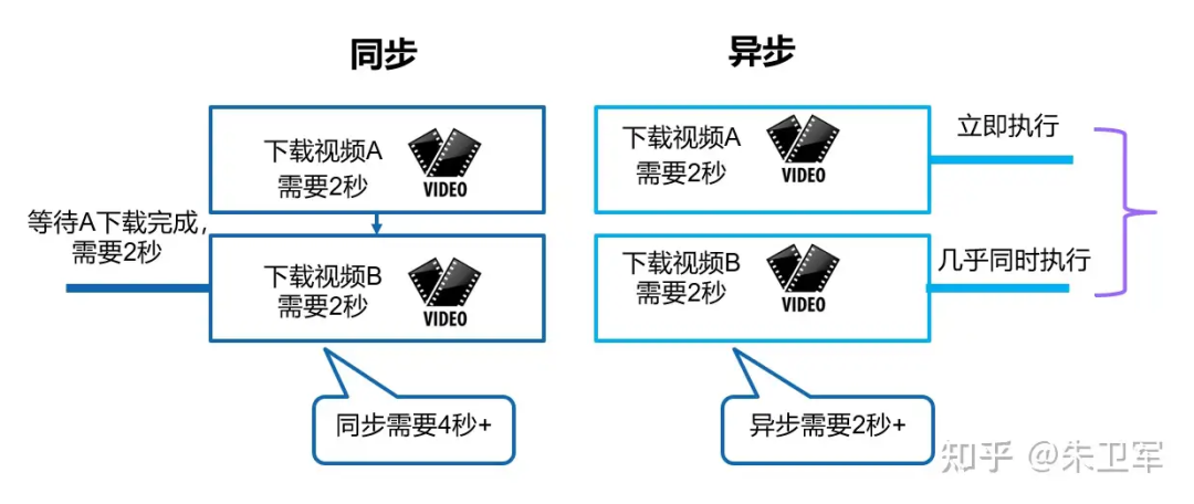 因为同步会阻塞,视频A下载好了才开始下载视频B。