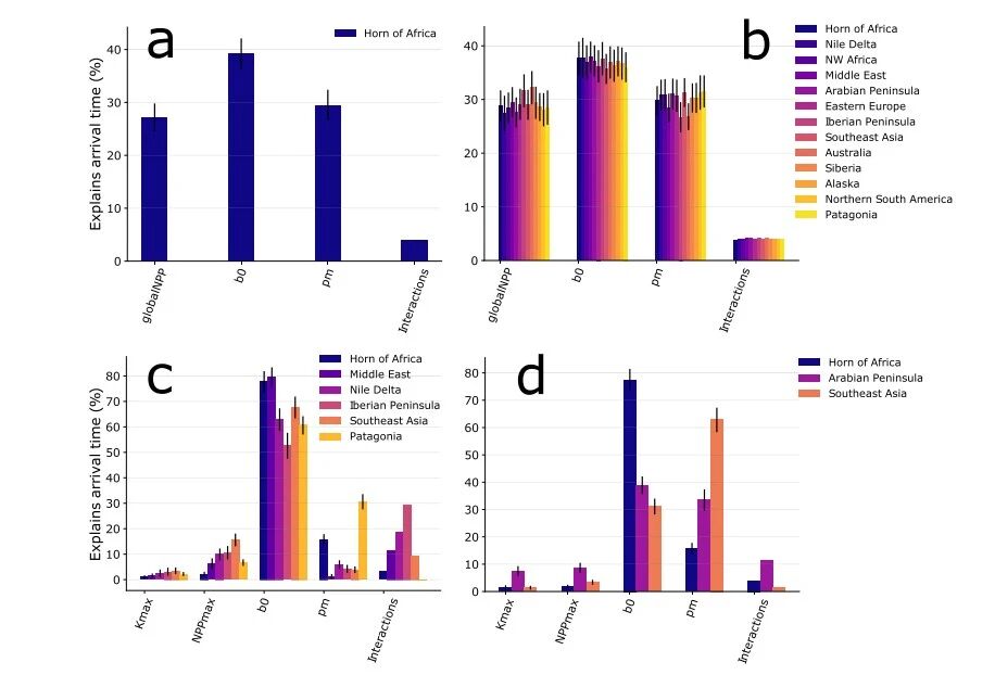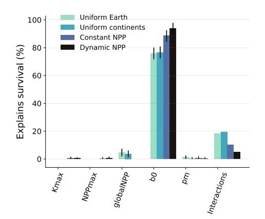 一、前言 目前几乎达成共识的是,智人(Homo sapiens)在非洲经历了漫长的进化过程,且我们的物种的非洲人群在晚更新世时期开始向全球扩散,最终实现了我们星球上所有可居住区域的人口定居(Groucutt et al.,2015;Galway-Witham, & Stringer,2018)。然而,关于人类如何在时间和空间上展开全球扩散的具体过程,仍然是一个激烈研究的问题。是否只有一次“走出非洲”事件,还是有多次扩散波,或是一个持续的人口流动?人类是否沿着特定的路线迁移,或是沿着环境梯度扩散?有哪些因素调控了非洲人口的扩散? 多种方法已经被用来重建这些扩散事件,包括古人类学、考古学以及基因和表型多样性模式的分析,这为理解人类空间时间人口扩散的复杂性提供了重要见解。例如,非洲以外的到达时间、人口瓶颈和创始人效应,本地人口的混血和替代现象(Liu et al.,2015;Bae et al.,2017)。此外,关于智人与古代人群(如尼安德特人和丹尼索瓦人)的混血的研究,也揭示了更长时间段和更大空间范围内的基因交流(Dannemann, & Racimo,2018;Wolf, & Akey,2018)。 这一领域的研究迅速发展,几乎每天都会产生新的扩散模式和动态证据(Harvati et al.,2019)。然而,关于这些扩散背后的原因和机制,我们仍在初步探索阶段。多种因素被提出可能影响这些扩散过程,如气候变化(Abbate, & Sagri,2012),海平面变化(Armitage et al.,2011),构造作用(Bailey, & King,2011),生态变化,动物群更替率(Palombo,2013),食物资源(Dennell,2003),人口统计(Dennell,2003)以及认知与技术文化(Tattersall,2009)。这些因素的组合可能共同促成了人类从非洲的扩散,但重建每个因素的具体影响仍是一项挑战。 问题在于,直接实验测试过去的扩散过程是不可能的,且现有经验数据稀缺且不完整。因此,计算机模型被用作“体内”实验平台,模拟不同的扩散情景,评估在现有经验数据下的可能性(Eriksson et al.,2012)。然而,计算机模拟测试替代情景存在局限性。首先,仅能明确测试少部分情景(Reyes-Centeno et al.,2015)。其次,是否最符合经验数据的模型情景是最可能的情景仍不确定。为此,使用近似贝叶斯计算(ABC)方法可以测试成千上万种模型参数组合,评估最可能的参数设置(Marjoram, & Tavare,2006)。这表明,气候、生态系统生产力以及资源利用率在过去的扩散过程中起了重要作用(Eriksson et al.,2012)。 为了解决这些问题,我们提出了一个新的扩散模拟模型,结合了个体和人口级别的参数,以及随时间变化的地理、海平面和气候条件。模拟的目的是探索不同扩散驱动因素的综合效应,而非复制历史扩散事件。我们之前已验证了该模型与理论预期的一致性(Callegari et al.,2013)。 图1展示了我们分析的不同阶段。我们使用基于二十面体细分的球形网格,每个节点与邻居相隔25到33公里。每个网格节点包含生物性(食物可得性)和非生物性(地理特征)属性。食物可得性通过净初级生产力(NPP)衡量,基于模拟的过去区域气温和降水量估算(Timmermann, & Friedrich,2016)。地理特征包括海拔(Amante, & Eakins,2018)、海平面(Waelbroeck et al.,2002)、冰盖(Ganopolski et al.,2010)和现今的河流(Made with Natural Earth,2018)。这些属性决定了每个节点的承载能力。我们使用坡度函数将节点的NPP转化为承载能力K,并根据地理特征修改K。例如,个体不能在冰覆盖或过高的地区生存,而河流和海岸线则增加了节点的承载能力。模拟从85千年前南部非洲的140个个体开始(“预热”阶段),大致与智人从非洲第二阶段的扩散相吻合(Groucutt et al.,2018)。在每个时间步,智能体可以执行不同的行动,如移动、交配和繁殖。智能体的移动方向是一个随机选择,依据邻近节点的海拔和承载能力加权,且彼此独立。 图1 研究设计。通过四种模拟情景(不同节点和种群参数设置)探究晚更新世人类灭绝与扩散的驱动机制。基于网格化模拟计算种群灭绝与迁徙抵达时间,并采用机器学习分析参数空间与模拟结果的关联,用于:结果可预测性评估;敏感性分析;相似抵达时间的参数组合识别。 除了网格节点的属性(即NPP和地理特征),我们还分析了个体移动概率(pm)和人口出生率(b0)对生存和扩散的影响。出生和死亡概率的计算方法见材料与方法。我们模拟了四个复杂度层次的扩散情景(图1):一个“均匀地球”情景,个体在没有特征的地球上朝任何方向以相等的概率移动;一个“均匀大陆”情景,个体在大陆形状的陆地上以相等的概率移动;一个“恒定NPP”情景,个体生活在时间不变的地形和NPP条件下;一个“动态NPP”情景,个体生活在随时间变化的地形和NPP条件下(Waelbroeck et al.,2002)。由于模拟计算代价高昂,每个85,000年的模拟需要2到5小时,且由于智能体模型的随机性,模拟需要多个重复。为了解决这些问题,我们使用了机器学习(Hastie et al.,2009)。我们构建了数学替代模型,通过对数据子集的测试,确保它们识别出数据的普遍模式,而不受参数值的影响。然后,我们使用替代模型进行敏感性分析,量化每个参数及其交互效应对结果的影响。 通过这种方法,我们回答了两个问题:a.在给定参数下,局部人口是否能生存?b.如果能,人口到达指定区域需要多长时间。我们构建了决策树,揭示了参数间复杂的相互作用,并分析了每个参数如何影响生存概率或到达时间。 二、研究方法 1、计算出生率和死亡率我们为单个个体确定了出生概率pb和死亡概率pd,其中出生概率为pb = b0,死亡概率为pd = d0 + (b0 - d0) * N / K。这