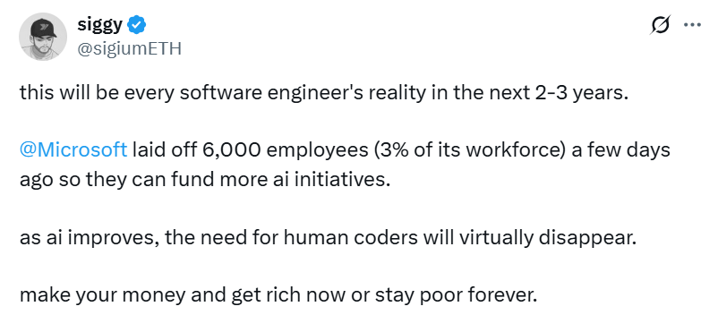 对此,一部分观点认为,“随着 AI 的改进,对人工编码人员的需求几乎将消失。这将是每个软件工程师在未来 2-3 年内的现实。”