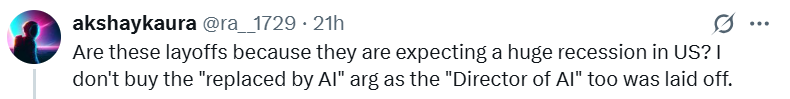 “不得不说,这事毫无积极意义,”一名用户发帖称,“一家满世界宣扬 AI 的公司……却解雇了 AI 总监?简直荒谬。” 还有用户调侃道: “难道 AI 已经开始自我指挥了?”