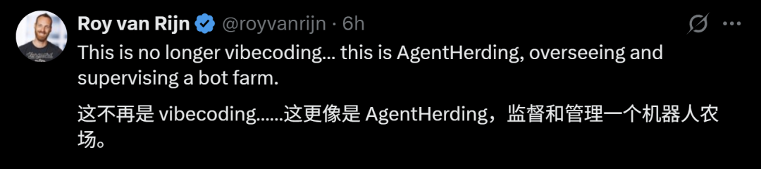 网友@Roy van Rijn评论,这不再是氛围编程,更像是监督和管理一个「机器人农场」。