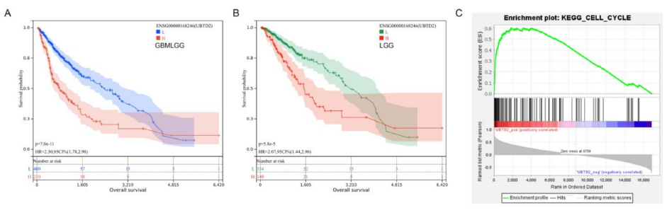 7. 单基因分析显示,UBTD2 的表达与胶质瘤的低存活率和细胞周期调控相关