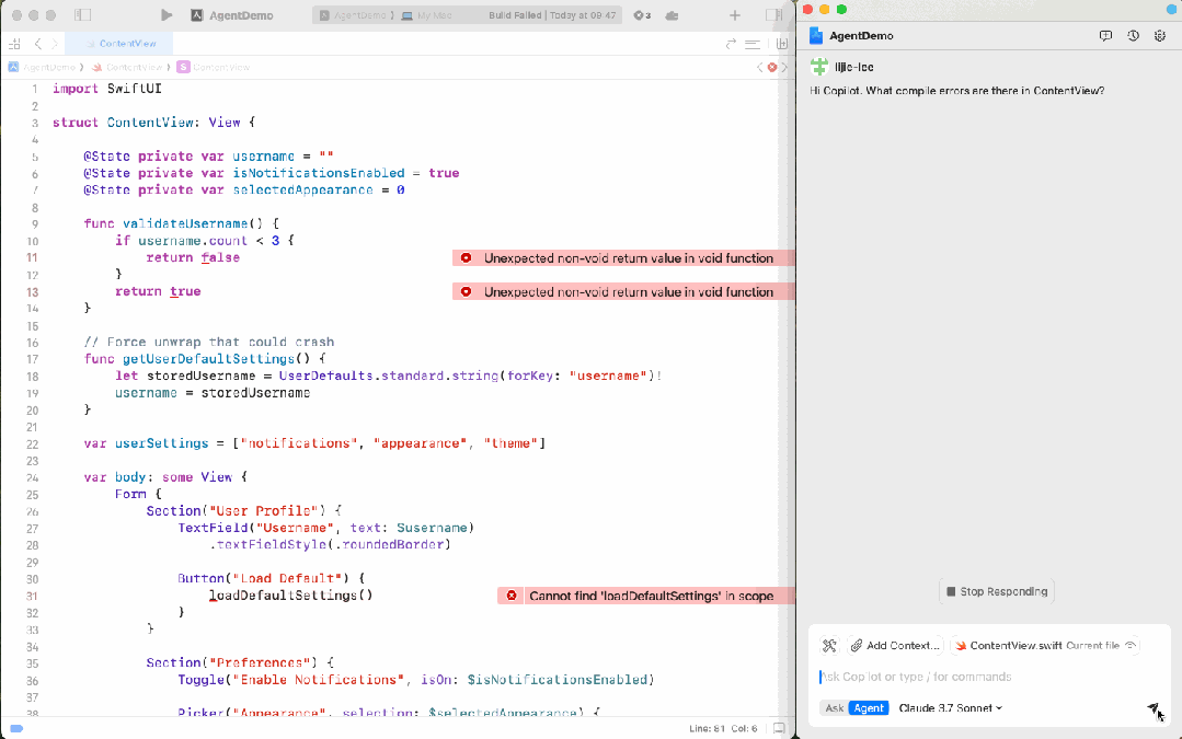 配置完成后,您可以使用自然语言调用 MCP 服务器提供的工具。 例如,您可以要求代理获取当前文件的最后修改时间,它将通过相应的工具路由请求。下面展示在Xcode中如何配置并使用。