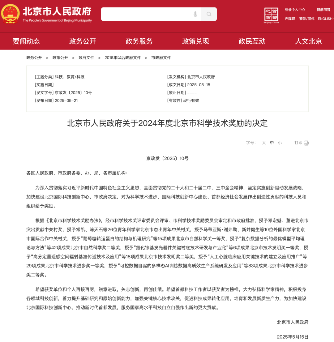 北京市人民政府发布了关于2024年度北京市科学技术奖励的决定,对为科学技术进步、国际科技创新中心建设、首都经济社会发展作出创造性贡献的科技人员和组织给予奖励。