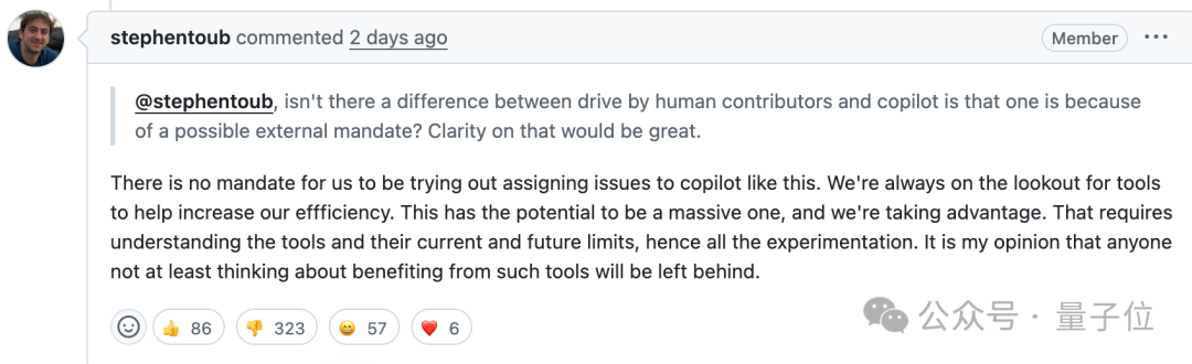 不过斯蒂芬老哥回复,使用Copilot不是公司强制性的要求,团队一直在实验AI工具以了解在当前和未来的局限性。
