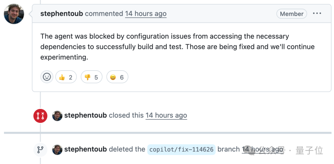 最终这条PR被斯蒂芬老哥手动关闭,他认为是由于配置问题,智能体无法访问所需的依赖项。
