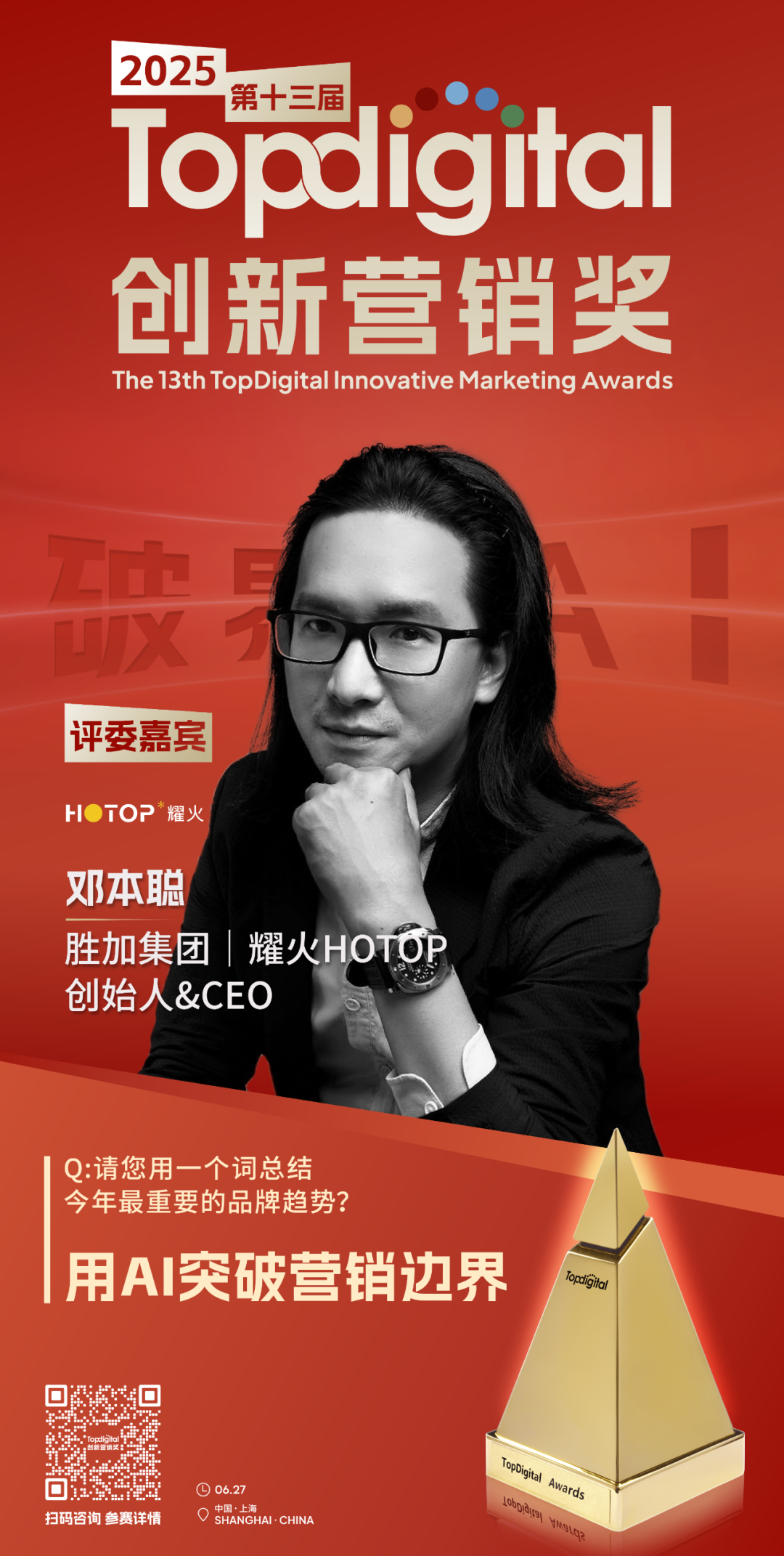 当生成式AI在1秒内完成人类72小时的创意产出,当智能算法精准预判用户下一秒的消费冲动,我们正站在营销革命的临界点。全球数字营销市场以23.6%的年复合增长率狂奔,AI技术的渗透率却在短短18个月内从实验性应用跃升为行业基建——这不是技术迭代,而是认知维度的颠覆性跃迁。2025年将成为AI发展的关键之年,在此背景下,2025第十三届TopDigital创新营销盛典以“破界· AI”为年度主题应势而生,一场解构商业本质的双向革命开启了!此次TopDigital非常荣幸邀请到胜加集团|耀火HOTOP创始人&CEO邓本聪加入专家评审团,与我们共同见证品牌典范、杰出产品、精彩案例以及优秀服务机构的诞生。