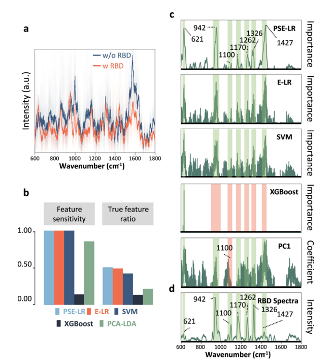 图4. 含和不含10-9 M RBD 的 G-AuNPs+PBS 的拉曼光谱。(a)含和不含 RBD 的 G-AuNPs+PBS 的平均和单个拉曼光谱。(b)含和不含 RBD 的 G-AuNPs+PBS 的拉曼光谱的特征重要性图和 PC1 的特征灵敏度和真实特征比。(c)PSE-LR、 E-LR、SVM 、XGBoost以及 PCA-LDA 的 PC1的正特征重要性图。各方法正确识别(漏检或误识)的两类之间的差异用绿色(红色)表示。黑线表示零。(d)RBD 的拉曼光谱。拉曼峰用绿色表示。