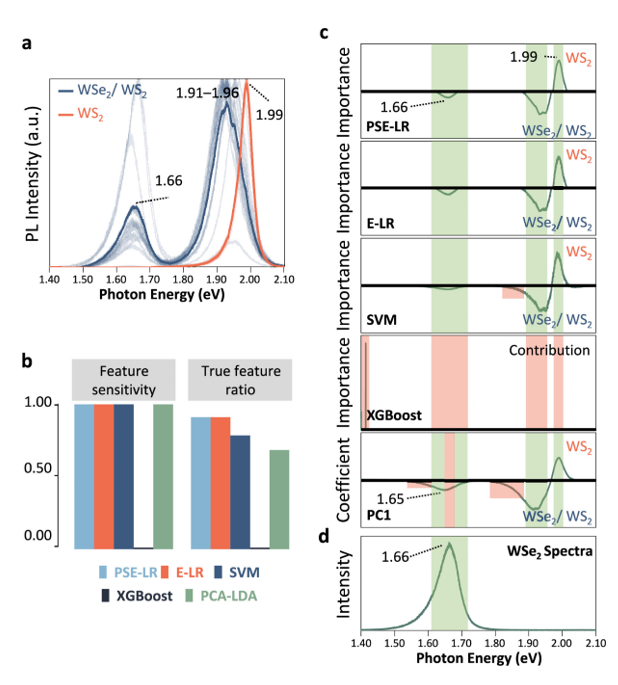 图5. WS2单层和WSe2/WS2异质双层的PL谱。(a)WS2单层和WSe2/WS2异质双层的平均PL谱和单个PL谱。(b)WS2单层和WSe2/WS2异质双层PL谱的特征重要性图和主成分分析(PC1)的特征灵敏度和真实特征比。(c)PSE-LR、E-LR、SVM、XGBoost以及PCA-LDA的PC1的特征重要性图。每种方法正确识别(漏检或误识)的两个类别之间的差异用绿色(红色)标记。黑线为零。(d)WSe2单层的PL谱。拉曼峰用绿色标记。