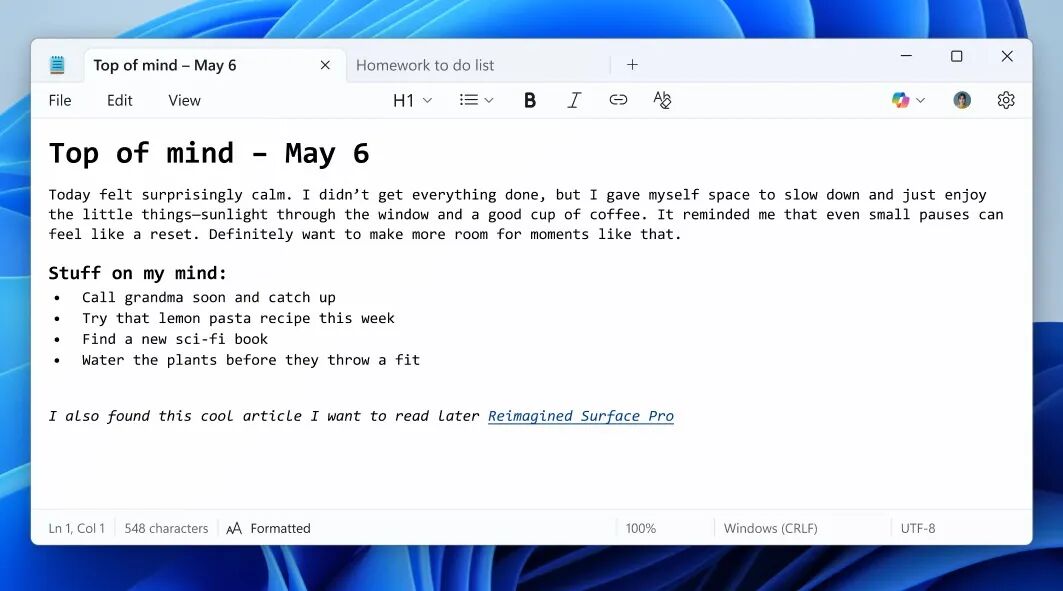 日前,微软在 Windows Blog 中发文宣布,目前已向 Windows 11 的 Canary/Dev 版本的用户推送最新版本记事本(11.2504.50.0 版本号)。据悉,上述版本的记事本正式加入了 Markdown 输入语法,支持大小标题、粗体、斜体、超链接、列表等功能。微软官方表示,记事本的 Markdown 支持开关,也可以一键清除所有 Markdown 文本的格式。