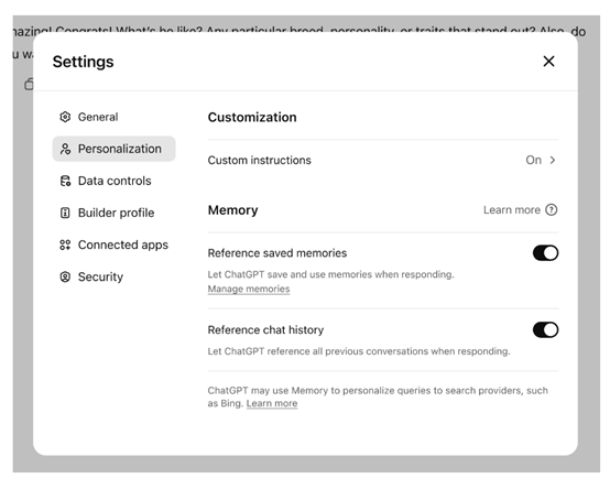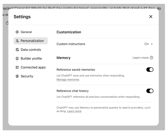 ChatGPT的记忆功能可以通过两个设置来控制:“引用已保存的记忆”和“引用聊天历史”。已保存的记忆是用户明确要求ChatGPT记住的细节,比如名字、喜欢的颜色或饮食偏好。