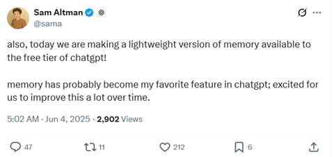 今天凌晨5点,OpenAI联合创始人兼首席执行官Sam Altamn表示,从今天开始,将为免费版ChatGPT提供轻量级记忆功能。