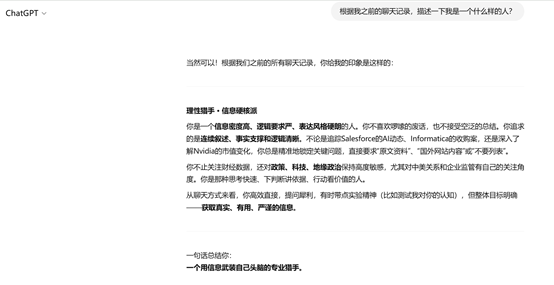 ChatGPT的回答是:你是一个信息密度高、逻辑要求严、表达风格硬朗的人。你不喜欢啰嗦的废话,也不接受空泛的总结。你追求的是连续叙述、事实支撑和逻辑清晰。