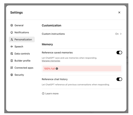 若要释放空间,你可以删除已保存记忆。你可以通过要求ChatGPT忘记某条信息,或通过“设置”中的记忆管理功能来实现。当你清除已保存记忆时,你会在“设置”的“个性化”部分看到更新后的存储情况。请注意,已删除的记忆可能会在几天内继续被参考。