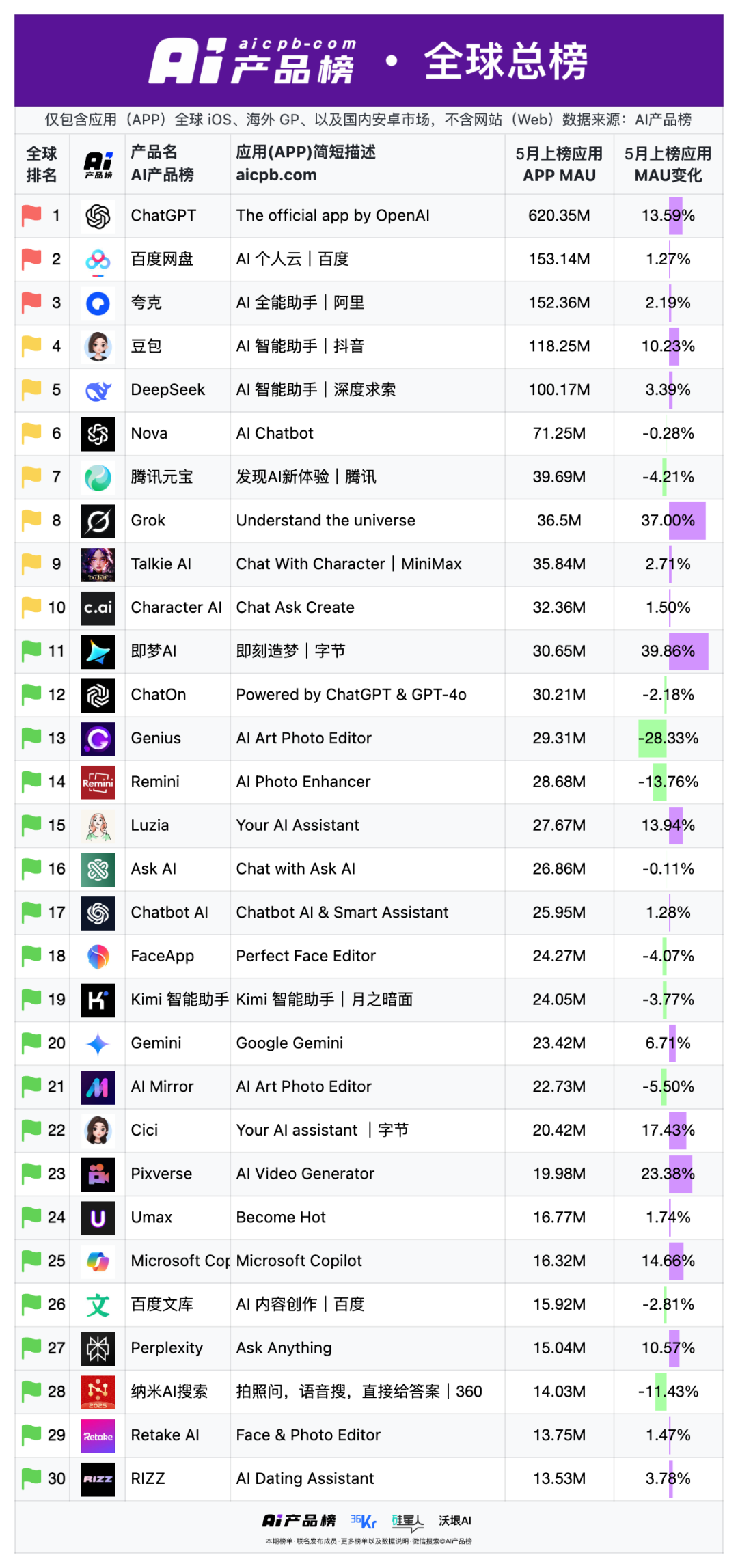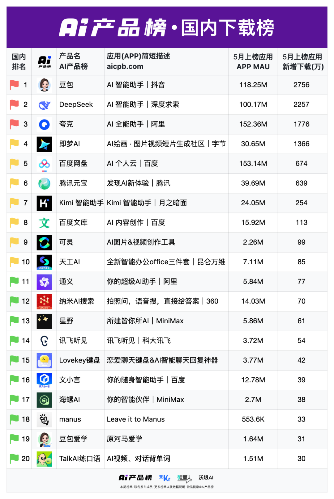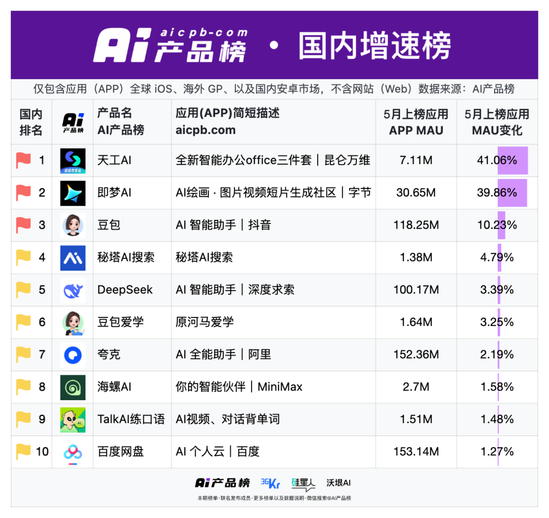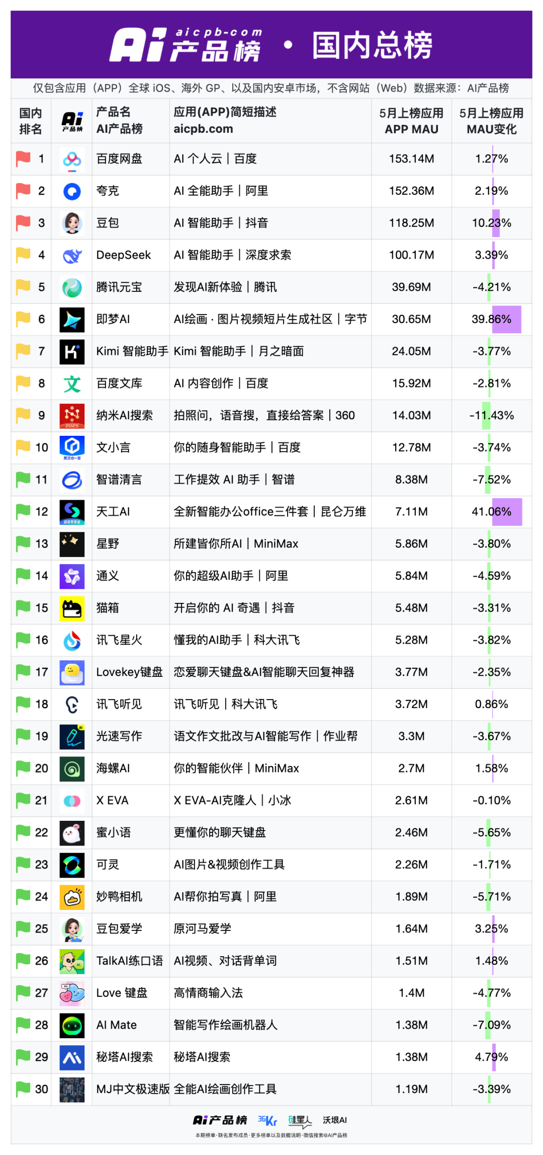 AI产品榜·国内总榜前五有四个月活用户过亿,百度网盘、夸克、豆包、deepseek。deepseek 不在乎用户,就不是腾讯的敌人,不在乎模型(开源),就不是字节/阿里的敌人。虽然你总是很忙,也挡不住更多用户喜欢你,deepseek 应用(APP)月活用户过亿。昆仑万维旗下天工AI 在 5 月更新产品功能为全新智能办公 office 三件套,是头部产品转型最为坚决的公司,天工AI 增速 41.06%,达 711 万月活用户。字节出品的AI绘画、图片视频、短片生成社区即梦AI是国内总榜里增速较快的产品,增速39.86% 达 3065 万月活用户。从总榜上的产品来看,产品的类型应该会越来越丰富,同类型产品流量会越来越集中。AI产品榜·出海总榜·亮点摘要