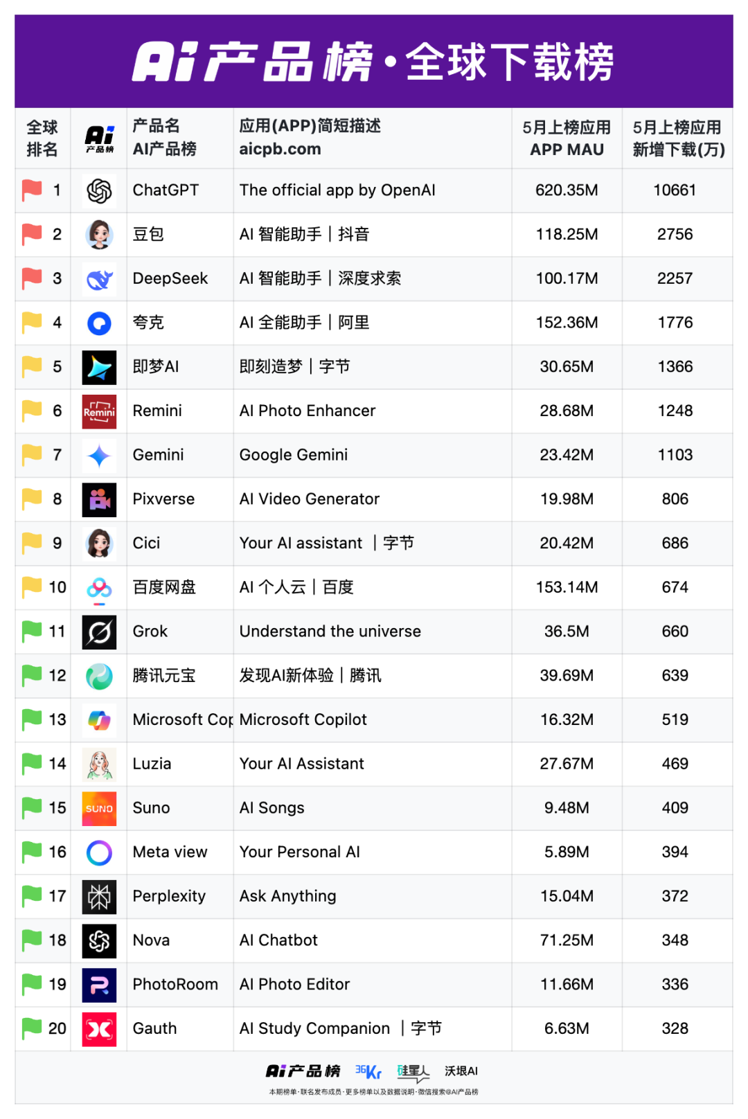 第 10 期 AI产品榜·应用榜(APP)(2025 年 05 月)由 AI产品榜、36kr、硅星人、沃垠AI 联名发布。 AI产品榜 2025 年 05 月榜