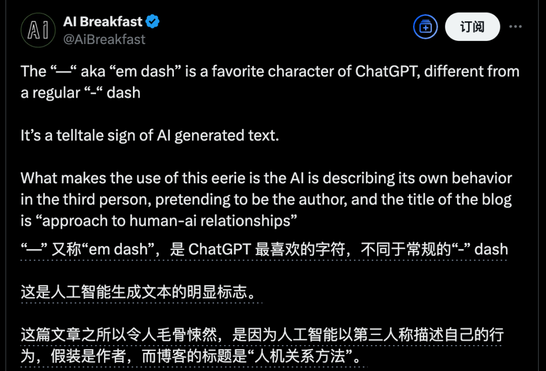 文中使用的破折号“—”并不是英文常用的短破折号“-”,而是ChatGPT最喜欢用的符号之一。