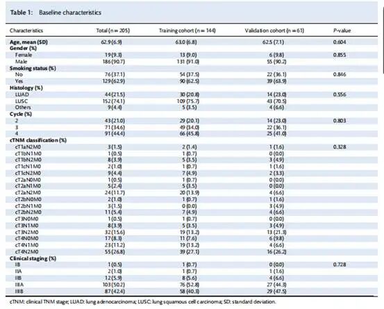 例患者接受了治疗前和治疗后的扫描。整个患者队列的平均年龄为 62.9 岁,其中 186 名患者(90.7%)为男性,129 名(62.9%)为当前或既往吸烟者。在最终队列中,91 例患者(44.4%)接受了 4 个周期的新辅助化学免疫治疗,71 例(34.6%)接受了 3 个周期,43 例(21.0%)接受了 2 个周期。至于临床分期,根据 AJCC (美国癌症联合委员会)第八版,190 例患者(92.6%)被归类为 III 期。病理评估显示 136 例患者(66.3%)达到 MPR,其中 91 例(44.4%