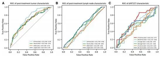 图 2:18F-FDG PET/CT 特征作为 pCR 的单个预测因子的预测性能。(A)治疗后肿瘤特征的 ROC 曲线,(B)治疗后淋巴结特征和(C)用于预测 pCR 的 18F-FDG PET/CT 变化特征。