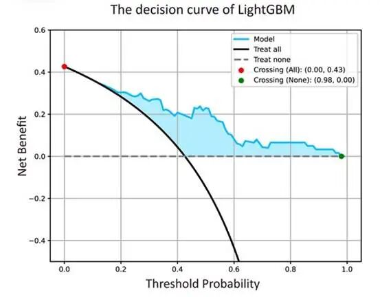 决策曲线表明,LightGBM 为 0.00 至 0.98 范围内的决策提供了重要的临床效用,特别是在 0.43 至 0.98 的阈值概率范围内(图 5). 其他 4 个模型的决策曲线显示在补充材料中,图 S5。