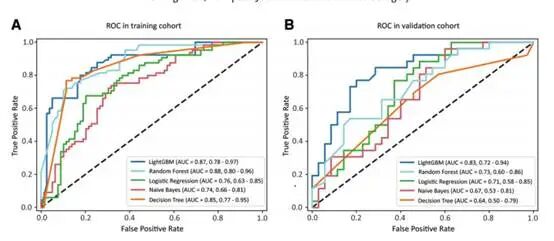 在训练队列中,所有模型都表现出相对较高的预测准确性,平均 AUC 范围为 0.74 至 0.88(图3A)。在验证队列中,LightGBM 实现了最高的预测性能(AUC 0.83;95% CI 0.72-0.94),优于决策树(AUC 0.63;95% CI 0.50-0.79)、随机森林(AUC 0.73;95% CI 0.60-0.86