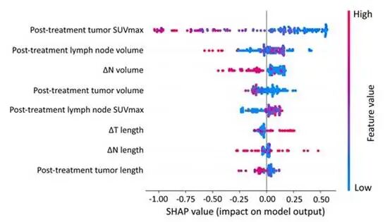采用 SHAP 分析评估所选变量对接受新辅助化学免疫治疗的 NSCLC 患者 pCR 预测的影响。LightGBM 模型确定治疗后 T SUVmax 和 N 体积是 pCR 预测的关键贡献者(图 4). 这些特征中的值降低与实现 pCR 的可能性更高相关。此外,残留肿瘤比例与治疗后 T SUVmax (r = 0.474, P < 0.001)和治疗后 N 体积(r = 0.224, P = 0.001)的相关性相对较弱,进一步支持了它们的预测相关性(补充材料,图 S4)。
