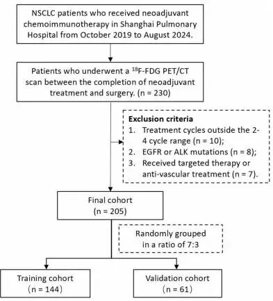 本回顾性研究分析了 2019 年 10 月至 2024 年 8 月在上海肺科医院接受新辅助化学免疫治疗和手术的 NSCLC 患者。所有患者在新辅助治疗完成和手术之间接受了 18F-FDG PET/CT,通常在治疗后 2 至 4 周和手术前 4 周内。排除标准包括超出 2 至 4 个周期范围的治疗周期、存在 EGFR 或 ALK 突变以及既往接受过靶向治疗或抗血管药物治疗。患者以 7:3 的比例随机分为训练队列和验证队列(图 1)。该研究遵循赫尔辛基宣言,并得到上海肺科医院伦理委员会的批准(编号 K24-679)。由于回顾性研究设计,放弃了知情同意。