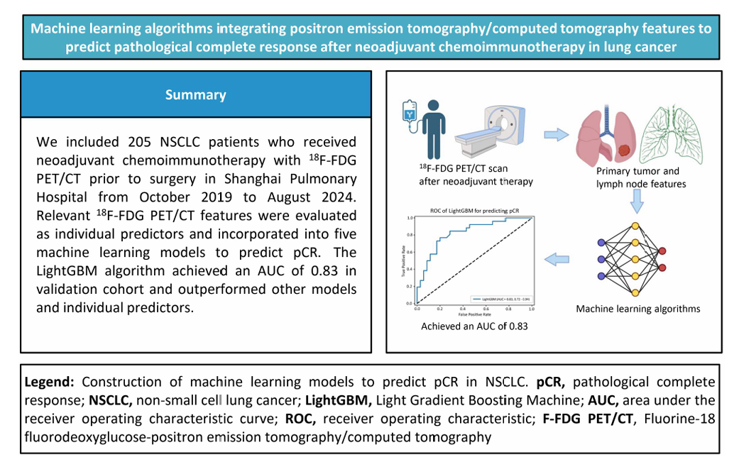 杂志:European journal of cardiothoracic surgery⽬的:预测接受新辅助化学免疫治疗的⾮⼩细胞肺癌(NSCLC)患者病理完全缓解(pCR)的可靠⽅法仍在探索中。尽管氟-18 氟脱氧葡萄糖- 正电⼦发射断层扫描/计算机断层扫描(18F-FDG PET/CT)特征反映了肿瘤反应,但它们在预测 pCR ⽅⾯的效⽤仍然存在争议。方法:本回顾性分析纳入了 2019 年 10 月至 2024 年 8 月在上海肺科医院接受新辅助化学免疫治疗后进行 18F-FDG PET/CT 显像的 NSCLC 患者。符合条件的患者以 7:3 的比例随机分为训练队列和验证队列。相关的 18F-FDG PET/CT 特征作为单个预测因子进行评估,并纳入 5 个机器学习(ML)模型。使用受试者工作特征曲线下面积(AUC)评估模型性能,并应用 Shapley 加法解释进行模型解释。结果:共纳入 205 例患者,其中 91 例(44.4%)达到 pCR。治疗后肿瘤最大标准化摄取值(SUVmax)在个体预测因子中表现出最高的预测性能,AUC 为 0.72 (95% CI 0.65-0.79),而ΔT SUVmax 的 AUC 为 0.65 (95% CI 0.53-0.77)。Light Gradient Boosting Machine 算法优于其他模型和单个预测因子,在训练队列中实现了 0.87 (95% CI 0.78-0.97)的平均 AUC,在验证队列中实现了 0.83 (95% CI 0.72-0.94)。Shapley 加法解释分析确定治疗后肿瘤 SUVmax 和治疗后淋巴结体积是关键因素。结论:该 ML 模型为预测 NSCLC 新辅助化学免疫治疗后的 pCR 提供了一种无创且有效的方法。引言:
