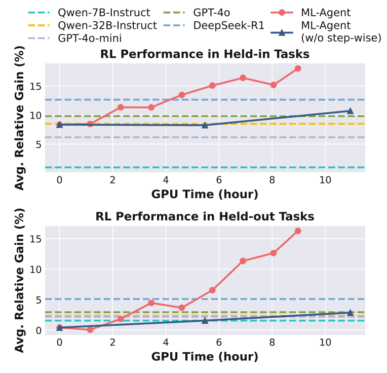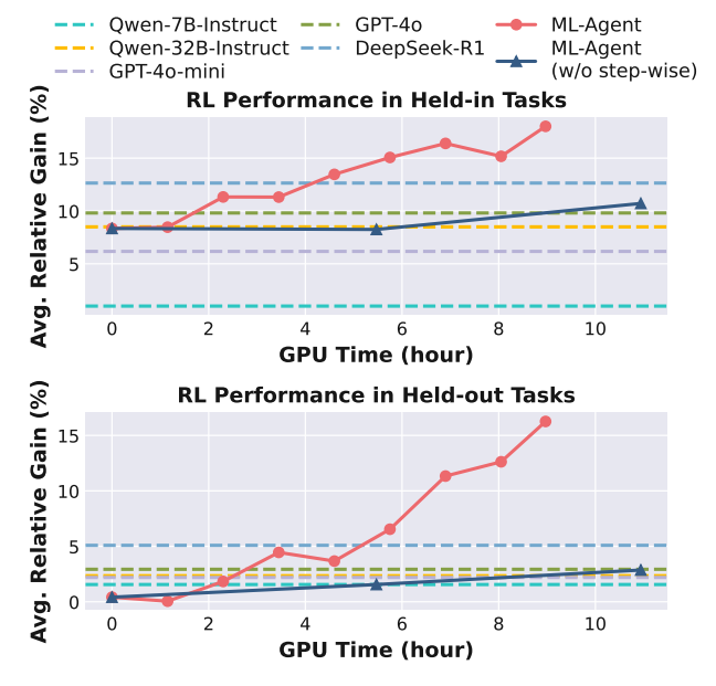 在保留任务和未保留任务上,分步强化学习(Step-wise RL)都比逐幕强化学习(Episode-wise RL)更高效。两种强化学习训练方法都从MLAgent-SFT开始。红色点之间的间隔是5步,而蓝色三角形之间的间隔是1步 从性能提升速度来看,逐步 RL 方法在训练初期就展现出了明显的优势。在 GPU 时间约为 1 小时时,逐步 RL 方法的平均相对增益已经达到了约 3%,而传统的基于剧集的 RL 方法可能仅能达到 1% 左右。并且,随着训练的进行,逐步 RL 方法的性能提升速度始终保持领先。例如,在 GPU 时间增加到 5 小时时,逐步 RL 方法的平均相对增益可能达到 10%,而传统的基于剧集的 RL 方法可能仅为 5% 左右。