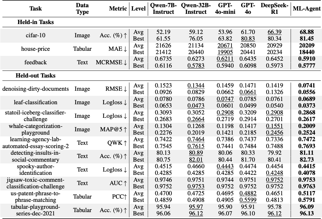 实验结果 实验结果显示,ML-Agent 在 3 个已见任务和 10 个未见任务上均表现出色,显著优于其他 5 个基于 MLAB 搭建的智能体。这些智能体包括不同参数规模的 Qwen2.5 模型(Qwen-7B-Instruct、Qwen-32B-Instruct)、专家级 GPT-4o-mini 和 GPT-4o 以及拥有 671B 参数规模的 DeepSeek-R1 等。 ML-Agent在3个训练内任务(包含在训练中)和10个训练外任务(训练期间未见过)上均优于基线模型。对于每个任务,我们报告了8条轨迹的平均分和最高分。表现最佳的模型以粗体突出显示,第二好的结果则以横线标出在已见任务中,例如 cifar-10 图像分类任务,ML-Agent 的最佳准确率达到了 81.45%,超过了 Qwen-7B-Instruct 的 76.05%、Qwen-32B-Instruct 的 63.82%、GPT-4o-mini 的 80.83%、GPT-4o 的 80.34% 以及 DeepSeek-R1 的 80.34%。这表明 ML-Agent 能够在其训练过程中充分挖掘任务的潜力,实现卓越的性能。