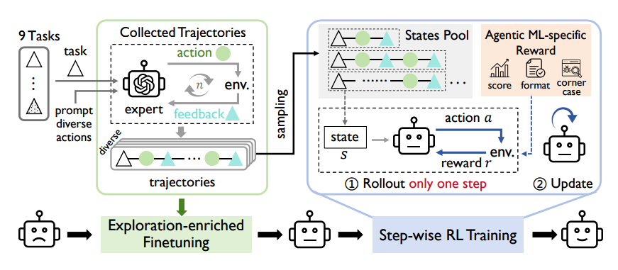 智能体机器学习训练框架概述:(1)探索增强的微调,用于创建多样化的行动池;(2)分步强化学习范式,利用专家轨迹高效收集经验;(3)针对智能体机器学习的特定奖励模块,用于处理各种机器学习反馈和进行任务特定的性能评估 在微调过程中,研究者们采用监督微调(SFT)方法,通过最小化专家轨迹与智能体生成的轨迹之间的差异,使智能体能够学习到专家的策略。这不仅确保了智能体输出的动作符合格式要求,还使其能够学习到多样化的策略,从而在后续的 RL 阶段中进行更广泛的探索。例如,在一个文本分类任务中,经过探索增强微调的智能体,不仅学会了如何正确地使用 NLTK 库进行文本预处理(如分词、去除停用词和词干提取),还掌握了一系列不同的特征提取方法(如 TF-IDF、Word2Vec 等)和模型架构(如逻辑回归、神经网络等)。这种多样化的能力为智能体在面对复杂多变的任务时提供了丰富的策略选择,使其能够更有效地应对各种挑战。